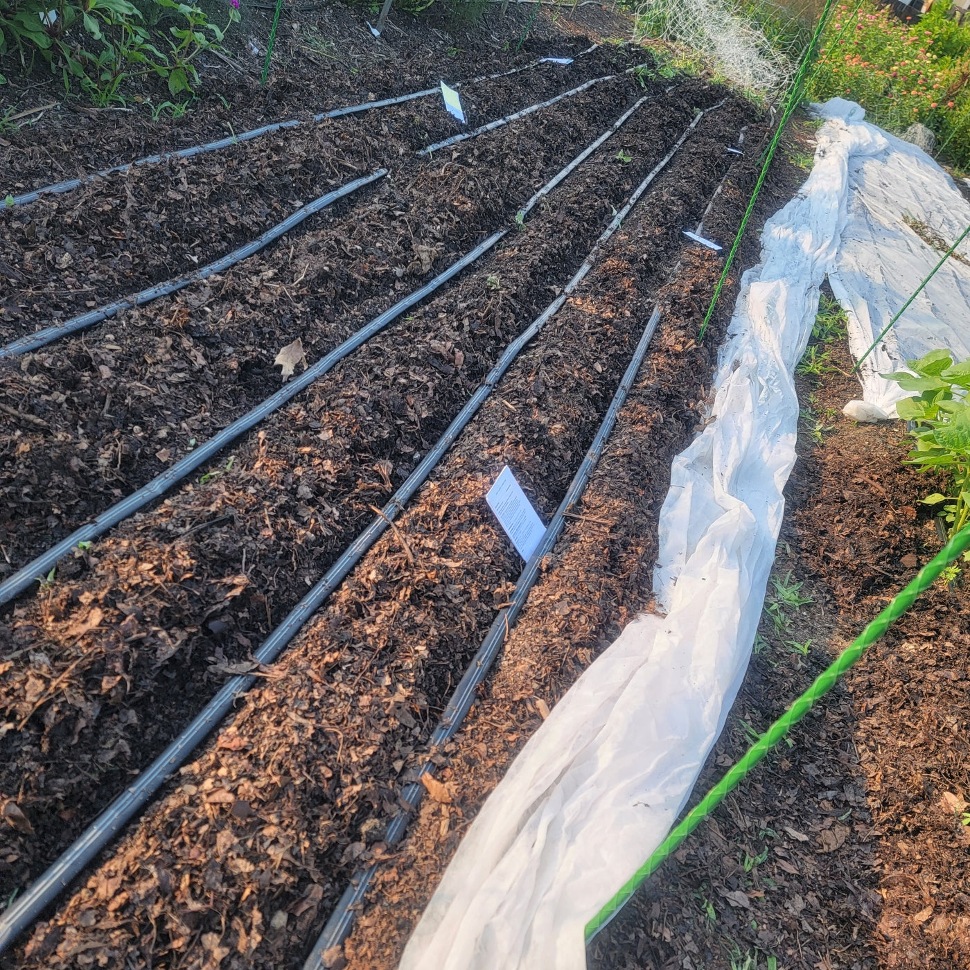 We cover our beds in shredded leaves in the fall and during the growing season. This also provides soil life, organic matter and protects the soil from losing moisture and being blown or washed away. We buy shredded leaves and we are also that crazy person who steals your bags of leaves in the fall. Not sorry.