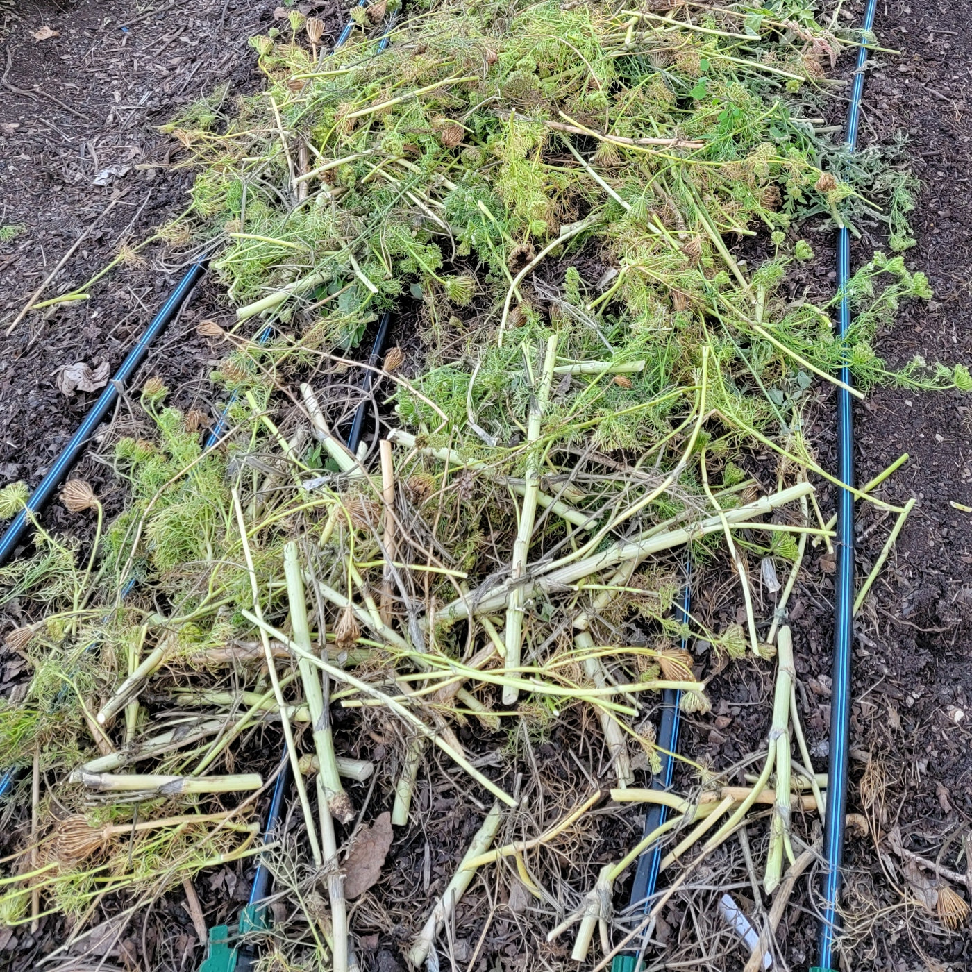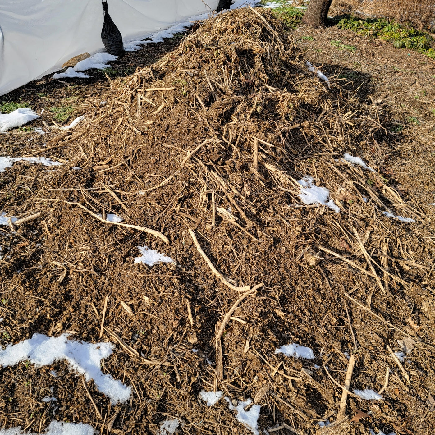 We keep our soil biology active by covering the soil with decomposing plants (like the plant cuttings in the picture above) or leaf mulch or tarp. In this way we keep the biology active and protected from erosion and weeds.